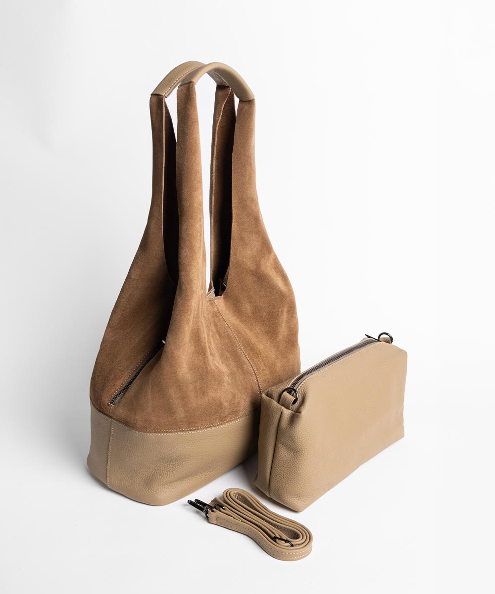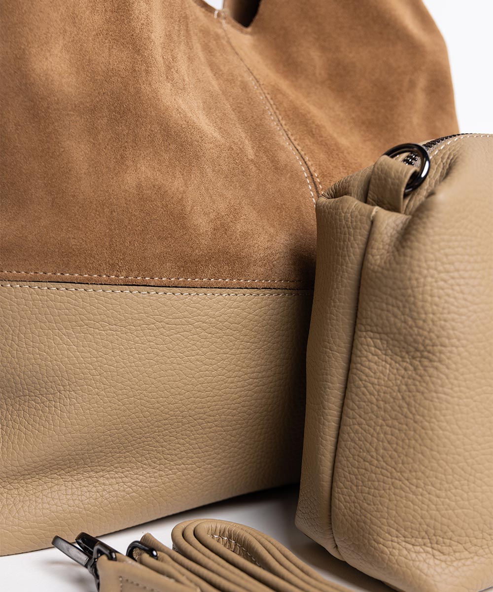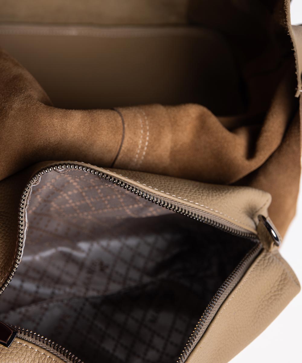Tašna RIO u bež boji predstavlja bezvremenski klasik sa modernim karakterom. Kombinacija prevrnute kože u gornjem delu i glatke kože u donjem segmentu daje snažan kontrast i sofisticiran izgled.