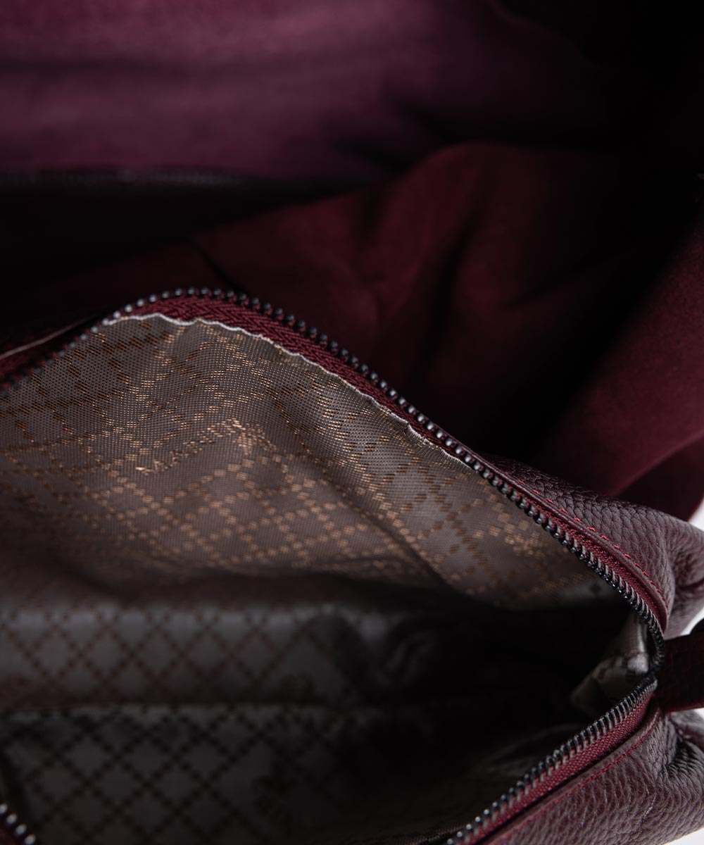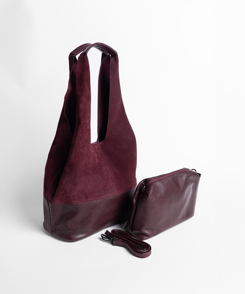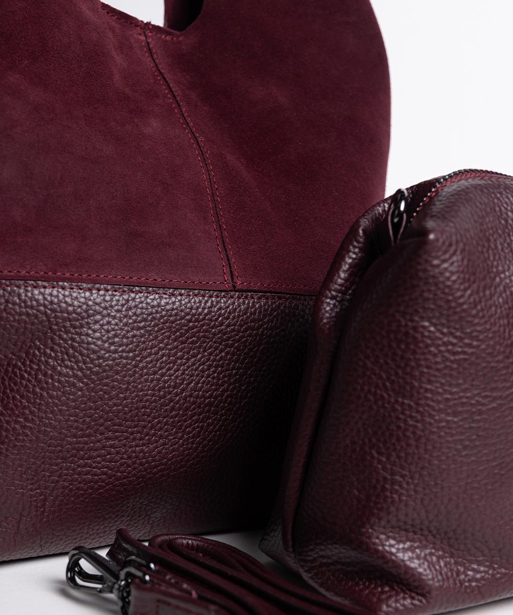 Tašna RIO u bordo boji predstavlja bezvremenski klasik sa modernim karakterom. Kombinacija prevrnute kože u gornjem delu i glatke kože u donjem segmentu daje snažan kontrast i sofisticiran izgled.