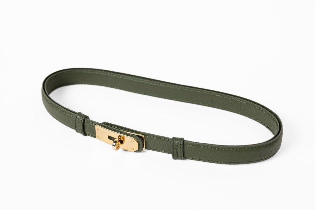 Ženski kaiš NOMO / 248 u maslinasto zelenoj boji sa zlatnim kopčanjem izrađen je od prirodne kože, sa prefinjenom teksturom i elegantnom metalnom kopčom. Ovaj model uklapa se savršeno uz svetle i pastelne kombinacije, dajući outfitu dozu ženstvene sofisticiranosti. Podesiva dužina do 111 cm omogućava idealno pristajanje.