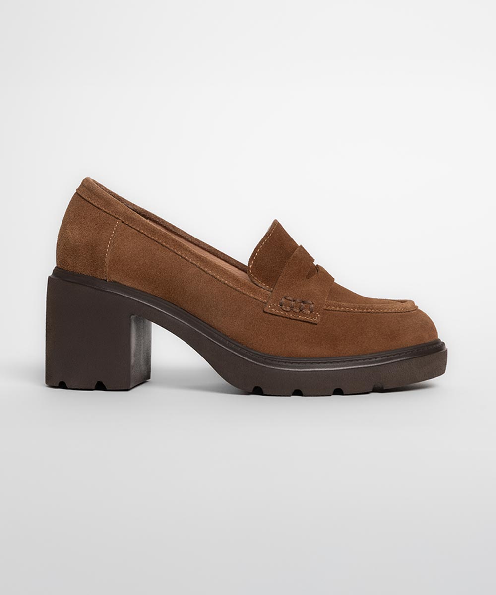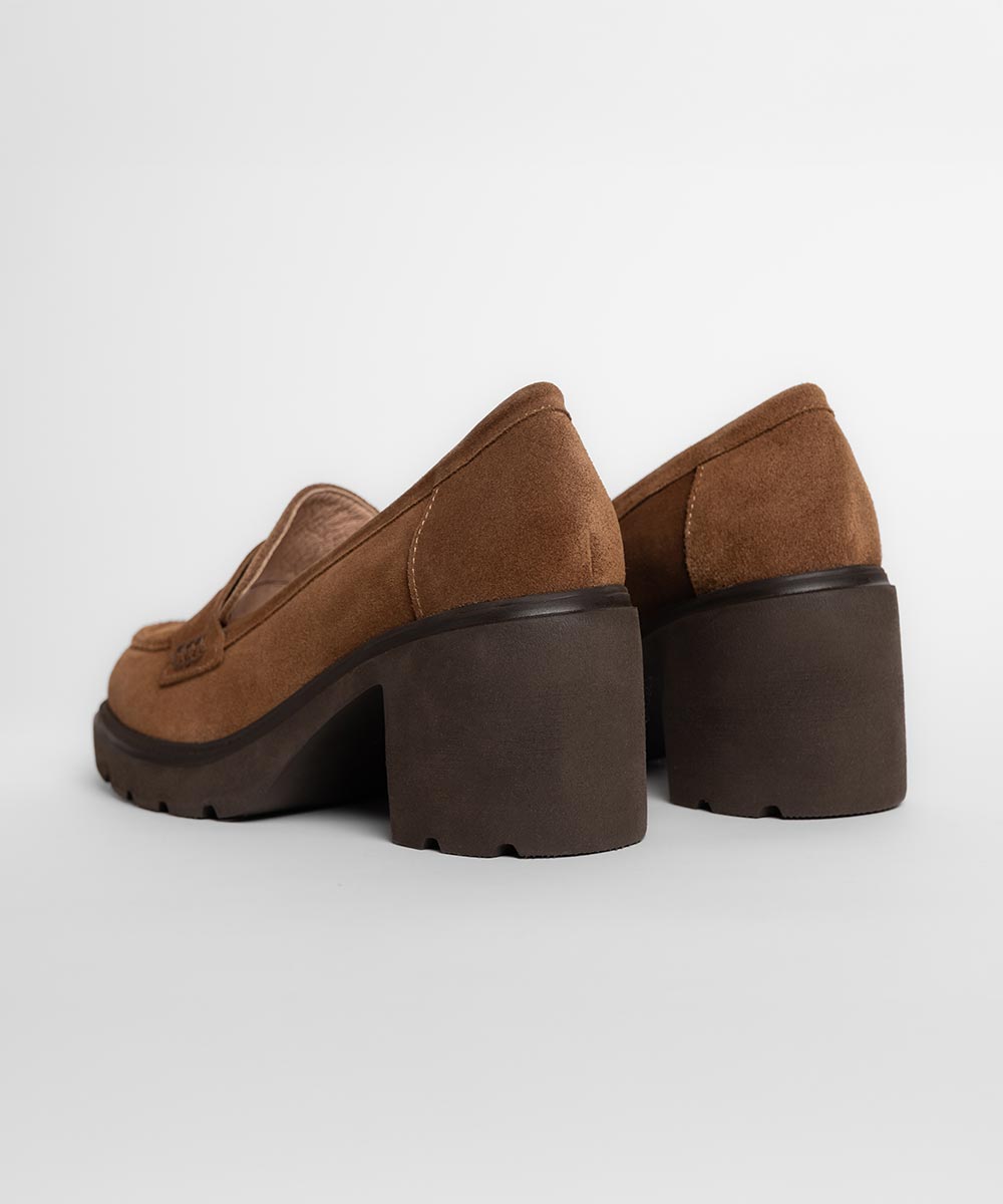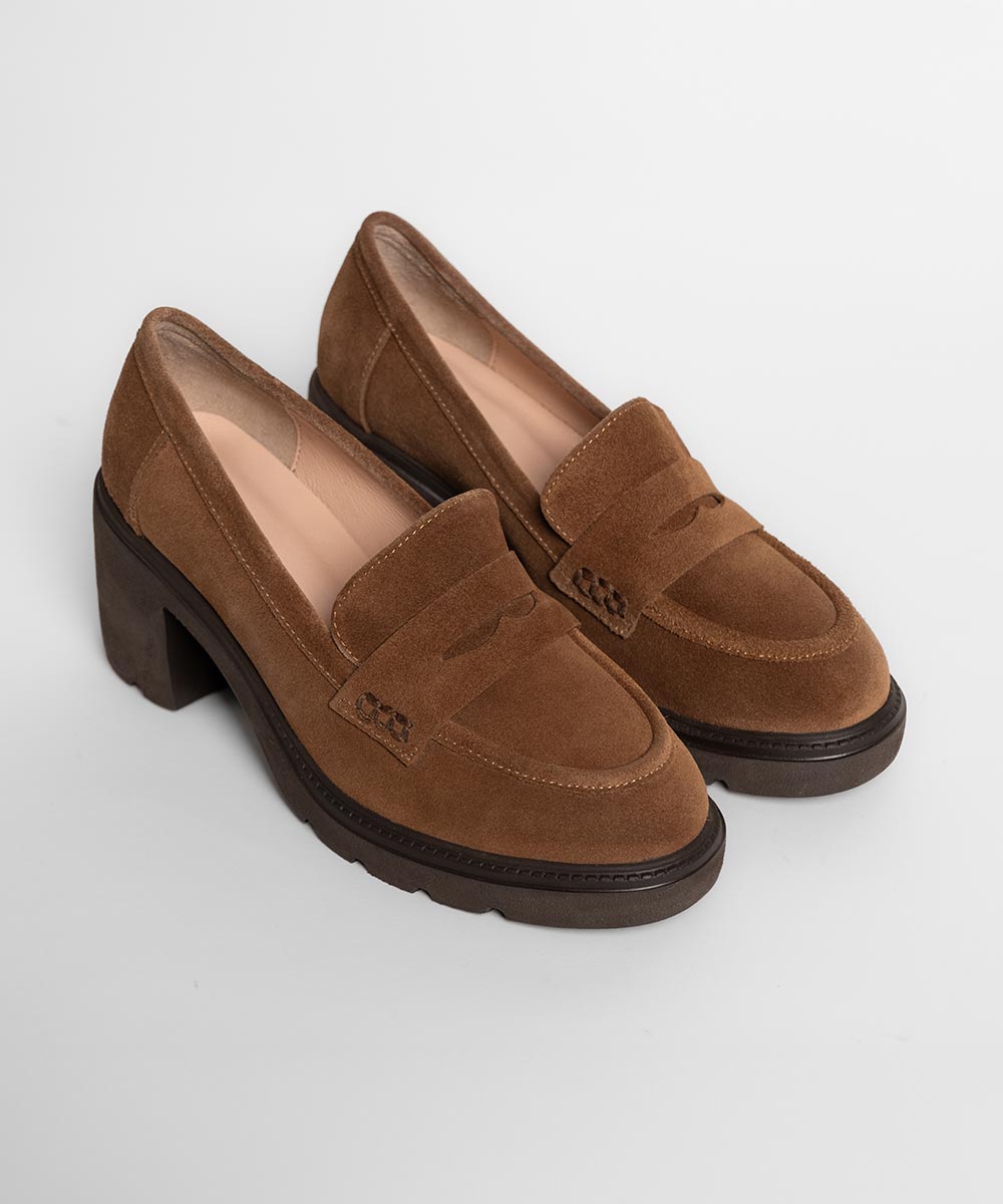Elegantne ženske mokasine sa stabilnom blok petom koje kombinuju klasičan stil i moderan dizajn. Izrađene od kvalitetne prevrnute kože (antilop), u toploj kamel nijansi koja se lako uklapa uz različite modne kombinacije.