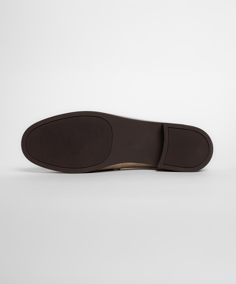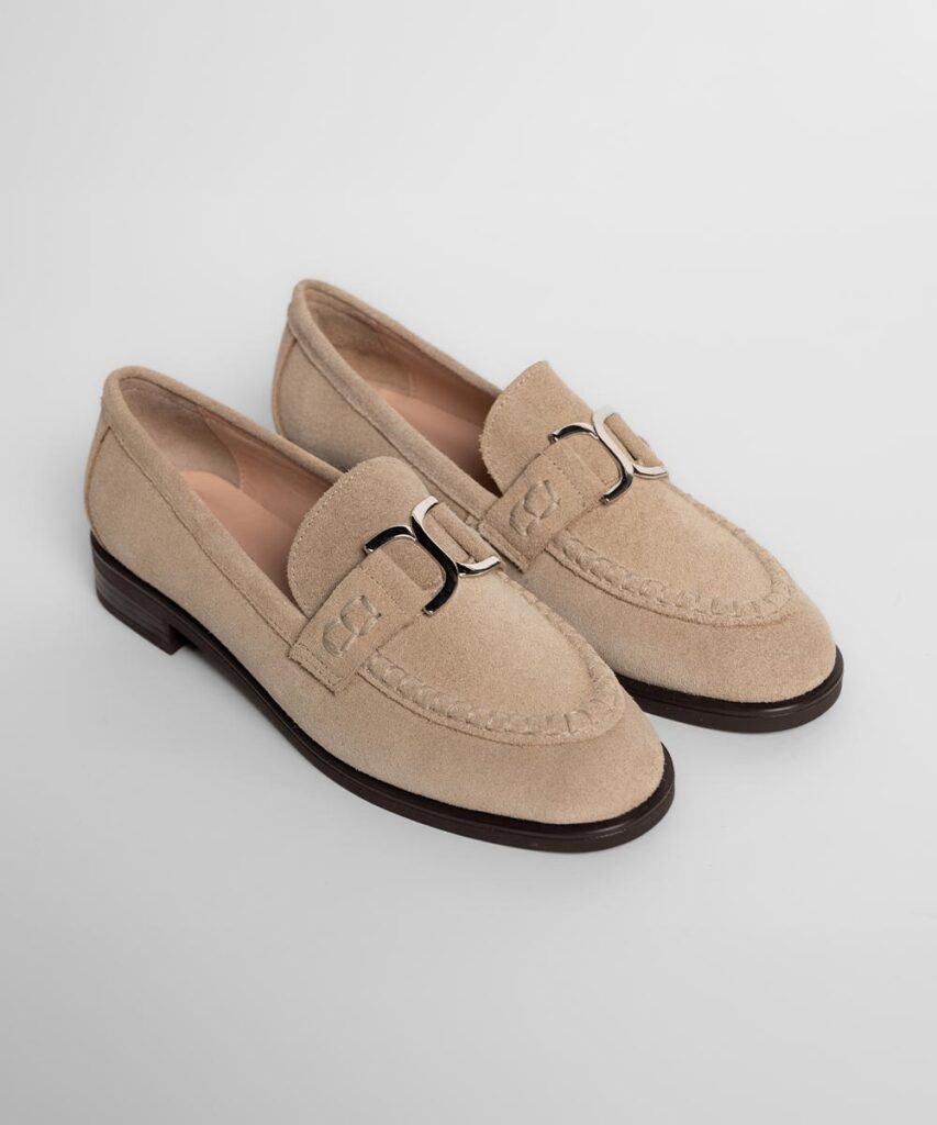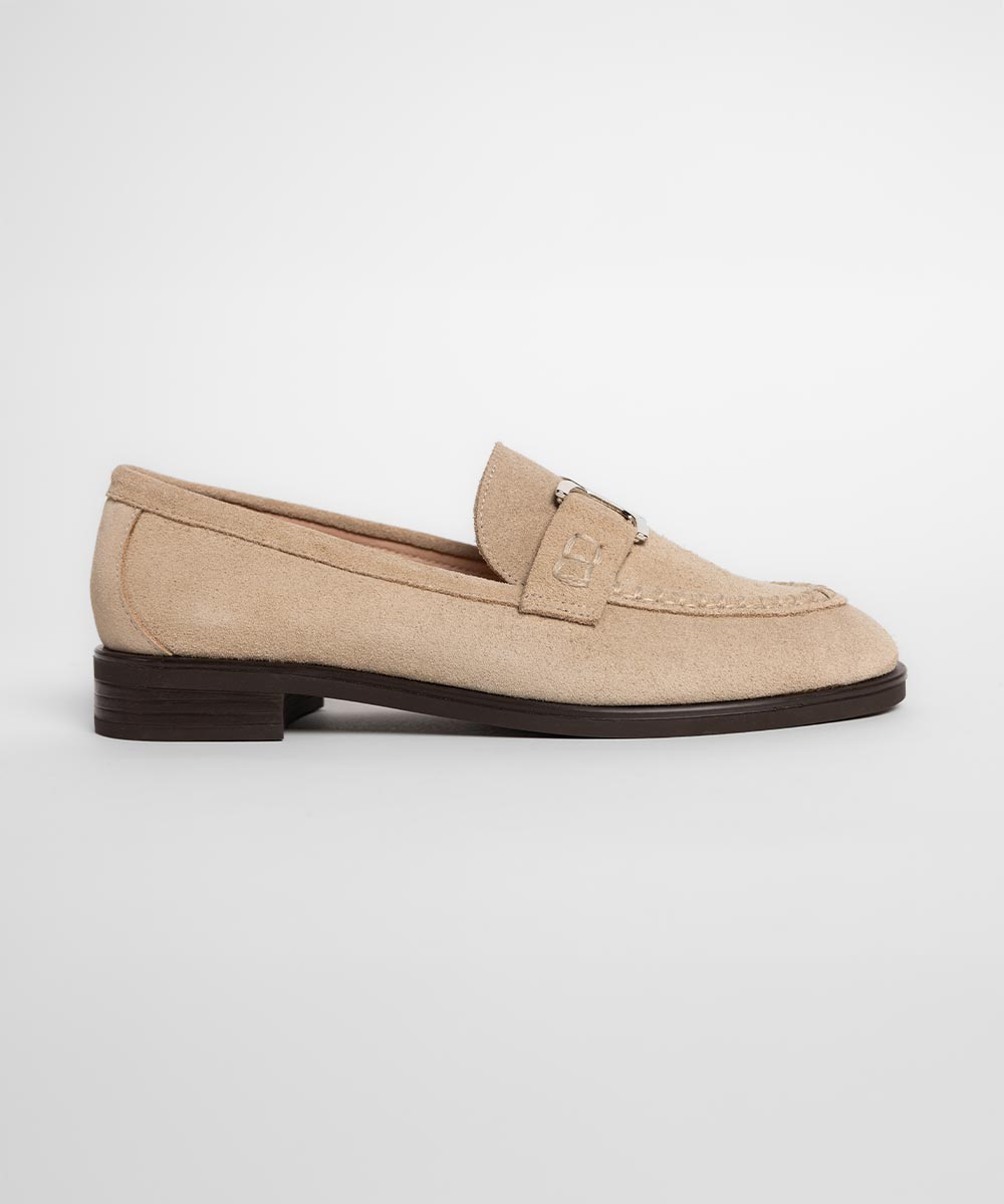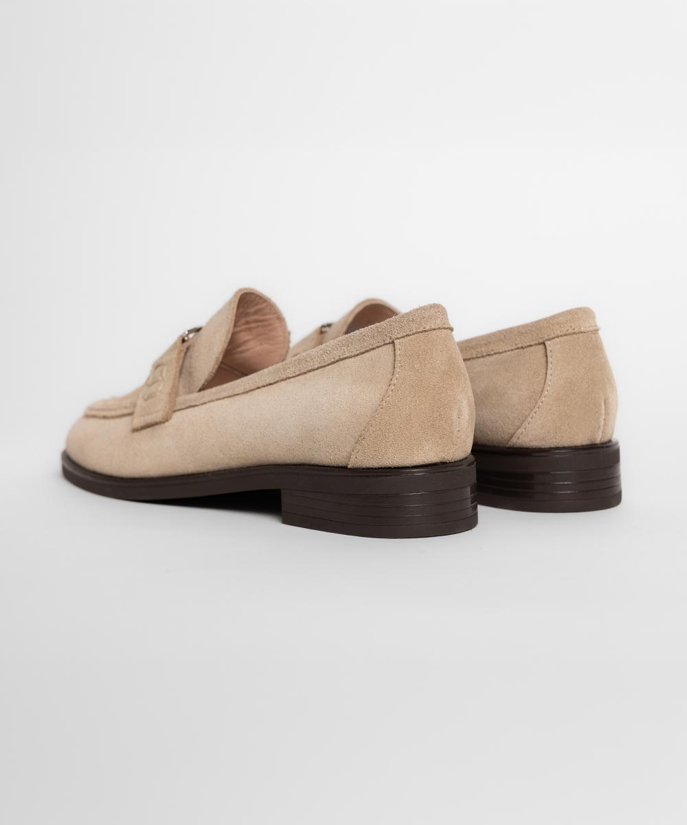 Elegantne ženske mokasine u svetlo bež nijansi, izrađene od fine brušene kože koje pružaju sofisticiran i nežan izgled. Klasična silueta sa dekorativnim metalnim detaljem na prednjem delu daje modelu modernu notu, dok niska stabilna peta omogućava udobnost tokom celog dana.