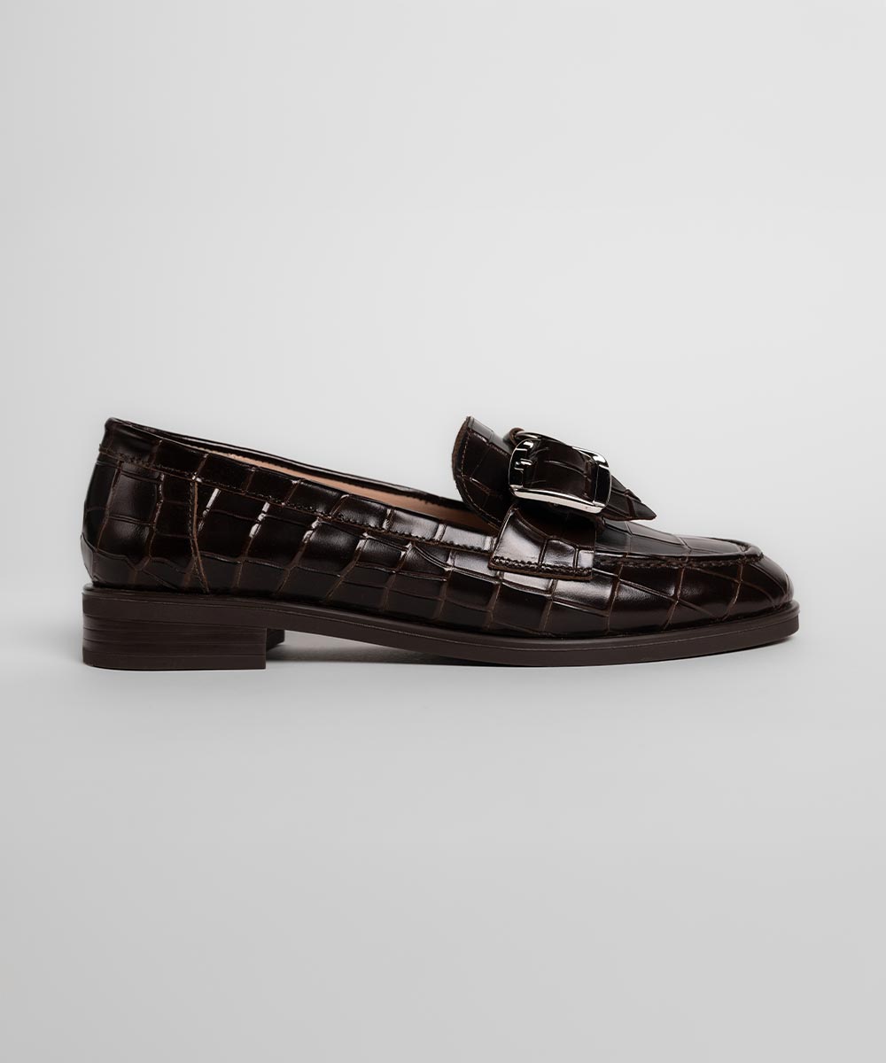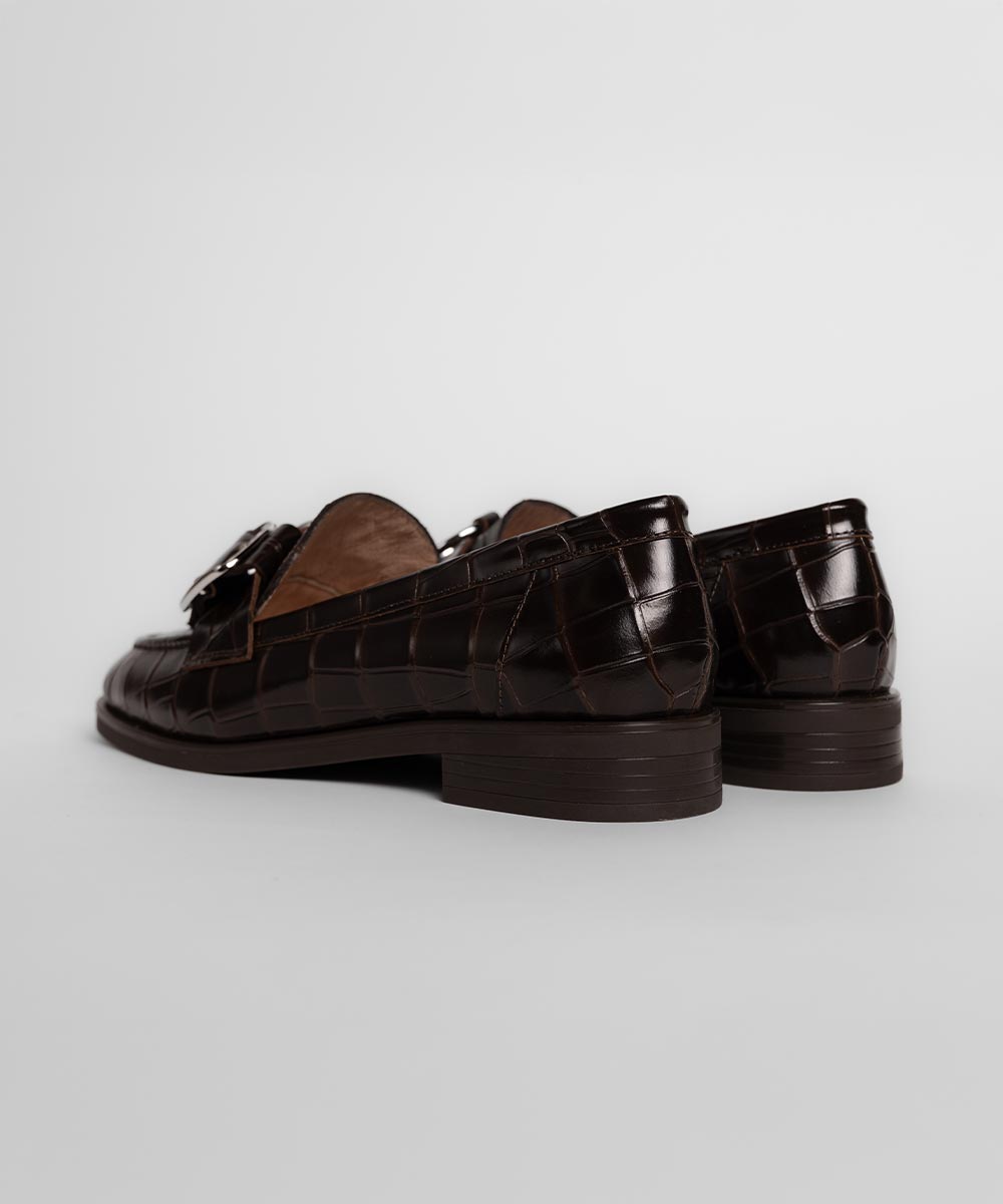 CARME ženske cipele u tamno braon boji odišu sofisticiranošću i modernom elegancijom. Reljefna koža sa krokodil efektom daje modelu luksuzan i upečatljiv izgled, dok dekorativna metalna kopča dodatno naglašava njegov karakter.